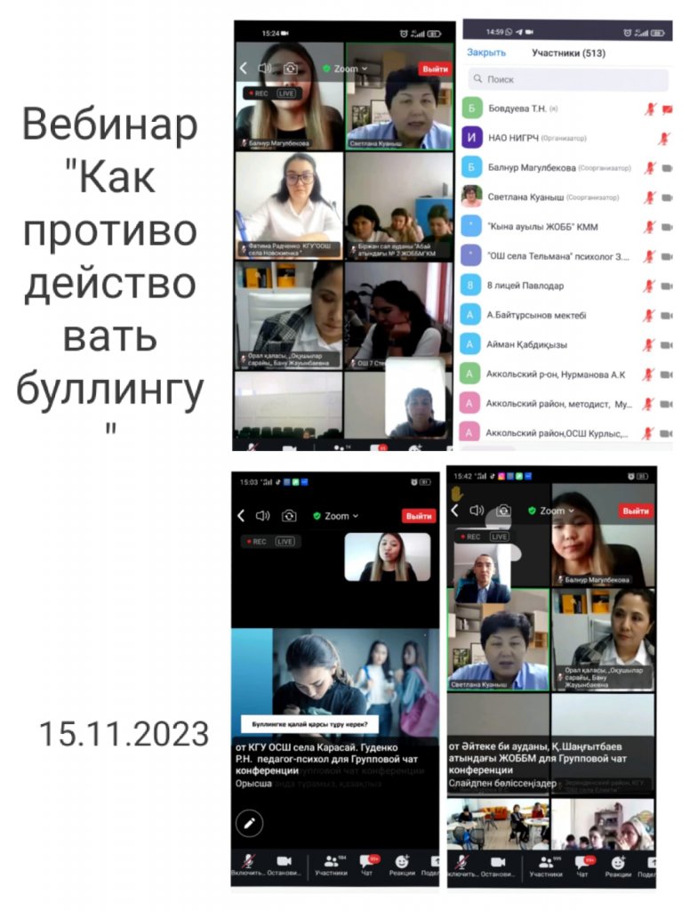 2023 жылғы 15 қарашада ZOOM онлайн-платформасында "БУЛЛИНГКЕ қалай қарсы тұру керек"тақырыбында облыстық вебинар өтті. Аталған вебинарға мектеп директордың тәрбие жөніндегі орынбасары А. Н. Тастемиров және мектептің педагог-психологы Т. Н. Бовдуева қатысты.