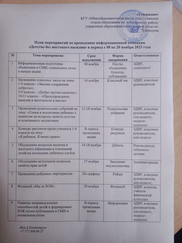 2023 жылғы 13 қарашада Сочинское ауылының учаскелік инспекторы А.Б. Нұртазин мектеп оқушыларымен Құқық бұзушылықтың алдын алу бойынша әңгімелесу өткізді, сондай-ақ ата-аналарға интернет алаяқтық туралы буклеттер берілді.