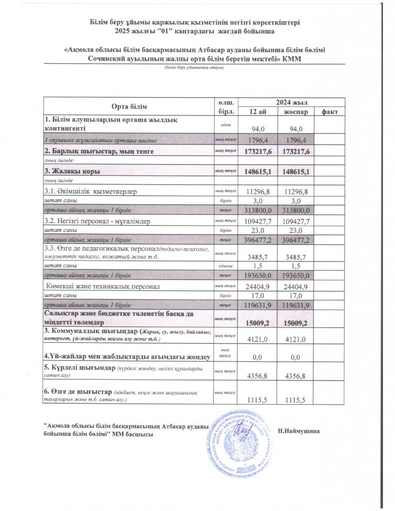 «Білім беру ұйымының қаржылық қызметінің негізгі көрсеткіштері 2025 жылғы 1 қаңтардағы жағдай бойынша»